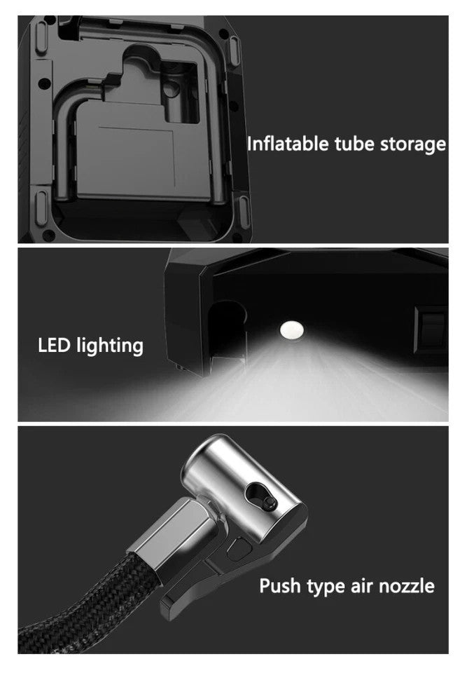 Convenience 12V cigarette lighter plug power source which means you can inflate your tires on road.
